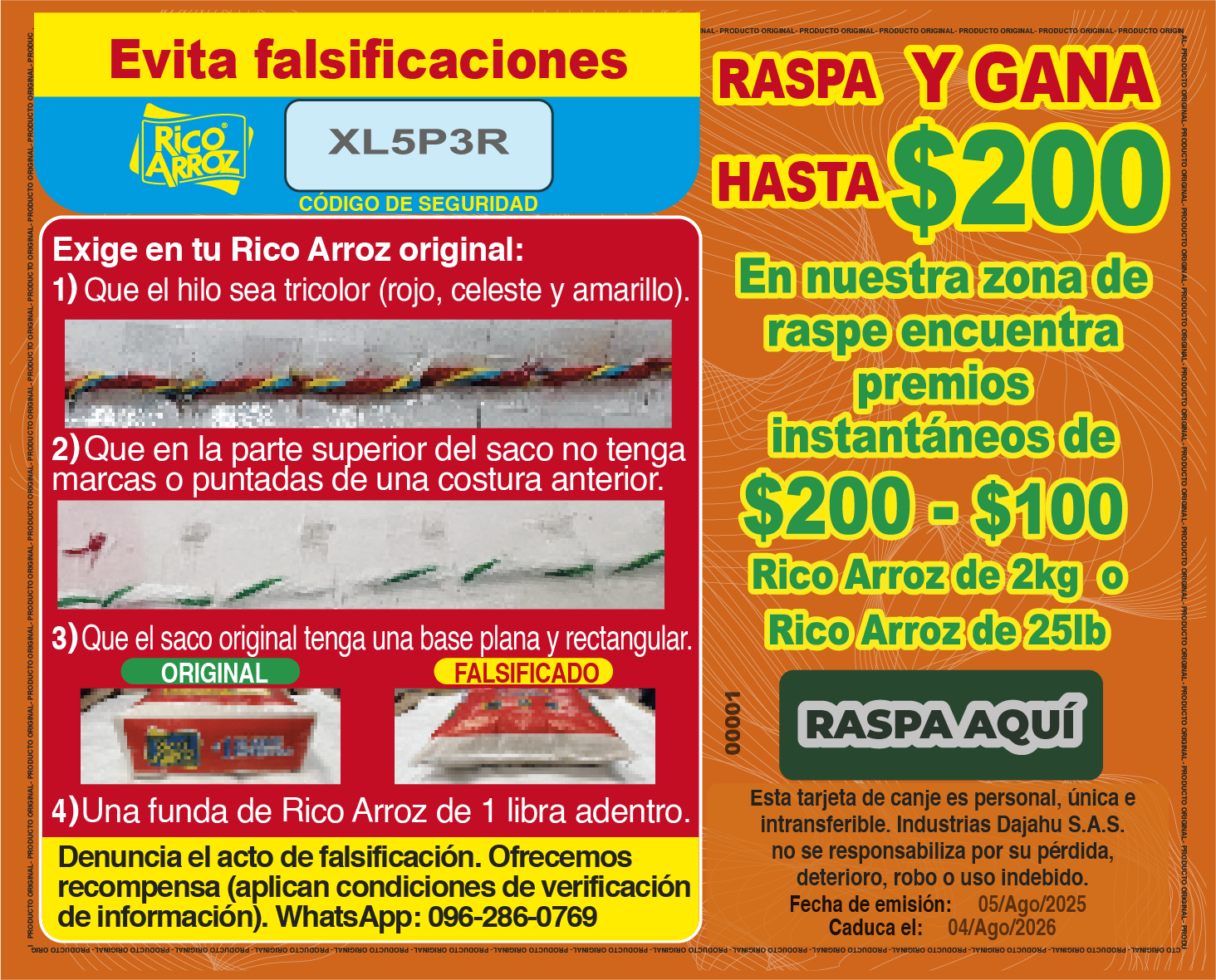 El sorteo se realizará el 20 de julio de 2026 ante notario público en la ciudad de Guayaquil. Los ganadores serán contactados telefónicamente y publicados en las redes oficiales de Rico Arroz dentro de los siguientes 5 días hábiles.